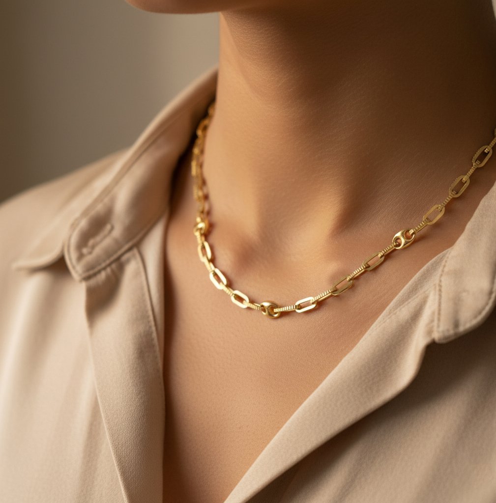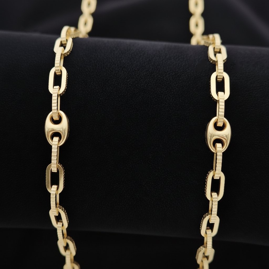 Los eslabones rectangulares están decorados con un delicado borde estriado que añade profundidad y carácter, mientras que los eslabones ovalados, totalmente pulidos, aportan suavidad y un brillo limpio que equilibra el conjunto. El resultado es una pieza elegante, ligera y cuidadosamente estructurada, ideal para quienes buscan una cadena con personalidad propia y un estilo moderno sin perder sutileza.