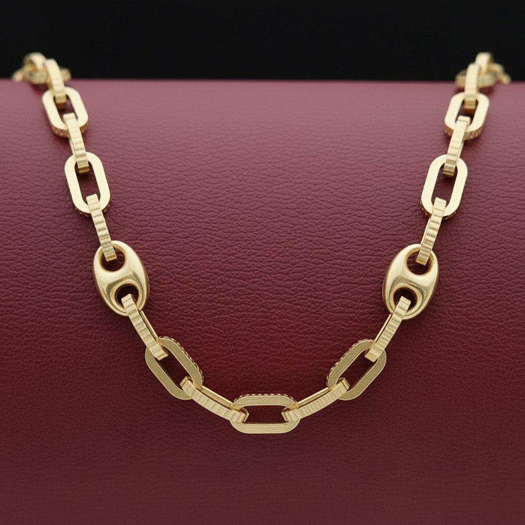 Esta cadena presenta un diseño distintivo que combina eslabones rectangulares finamente texturizados con enlaces ovalados lisos que funcionan como puntos de contraste visual. La alternancia entre los eslabones lineales y los eslabones pulidos crea un ritmo único, dando a la cadena una apariencia dinámica y diferente a los modelos tradicionales.