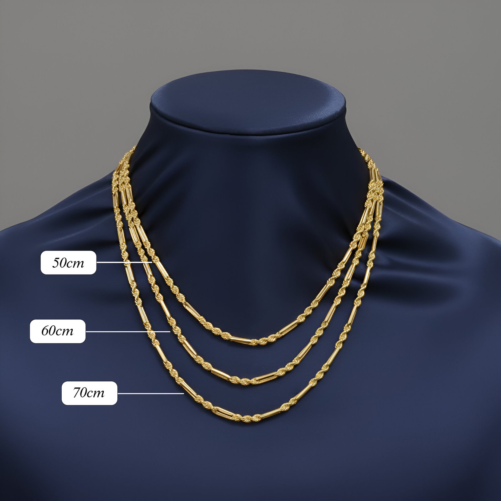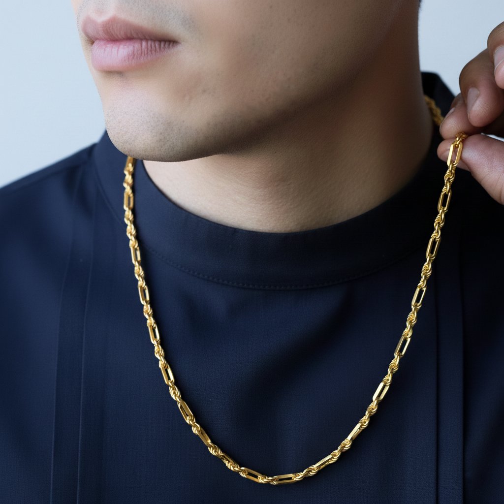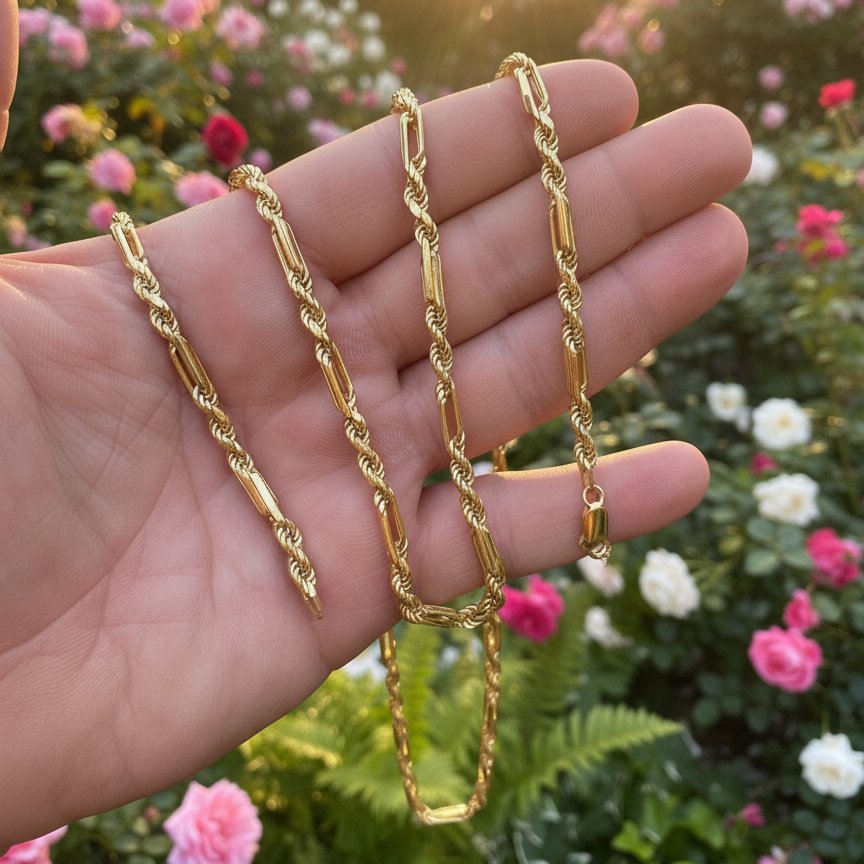 La cadena Fígarope Milano es una expresión del estilo italiano más distinguido. Nacida en las joyerías de Milán, su diseño combina ritmo y precisión en una secuencia de eslabones que alternan formas largas y cortas con armonía perfecta. Cada enlace parece moverse con fluidez, creando una silueta continua que capta la luz y realza su presencia.