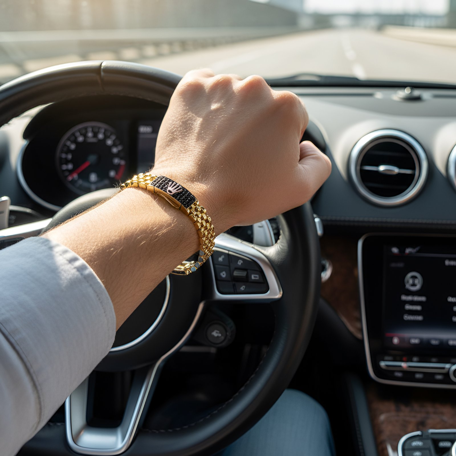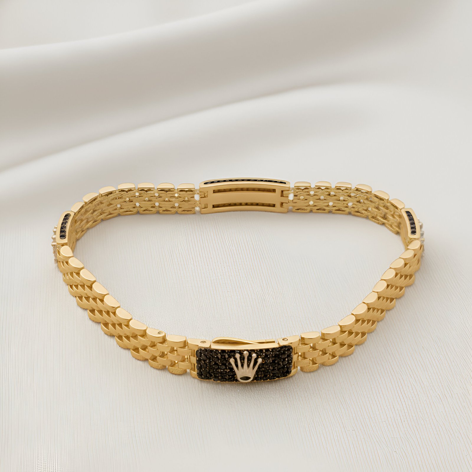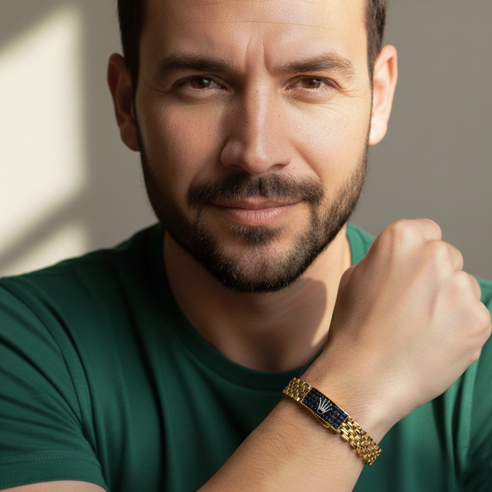 Presentamos una pieza que personifica el lujo atemporal y el prestigio para el caballero contemporáneo. Confeccionada con la pureza y el brillo inigualable del Oro de 18 kilates, el brazalete luce un diseño de eslabón robusto y pulido que aporta una textura rica y elegante. El cierre central rectangular es la esencia de esta joya, embellecido con un deslumbrante pavé de piedras negras que crean un contraste dramático.